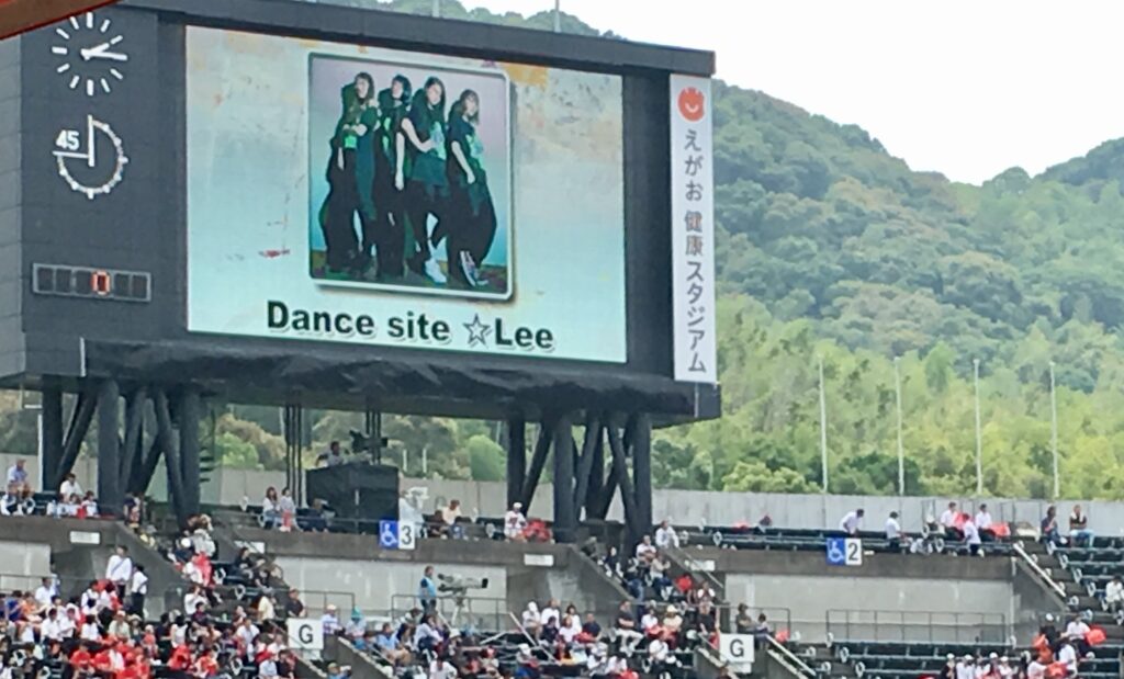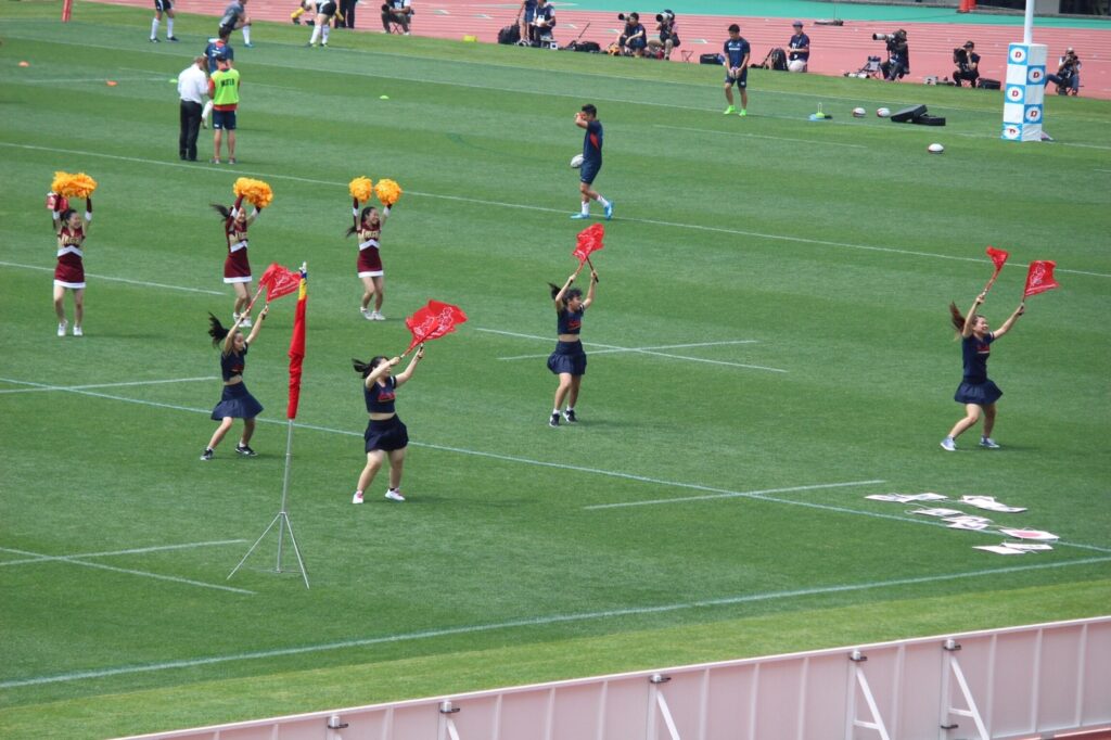 チアダンスの方々と一緒にハーフタイムショーで踊り、ラグビーの応援と共に熊本地震からの復興をがんばっていることをアピール。