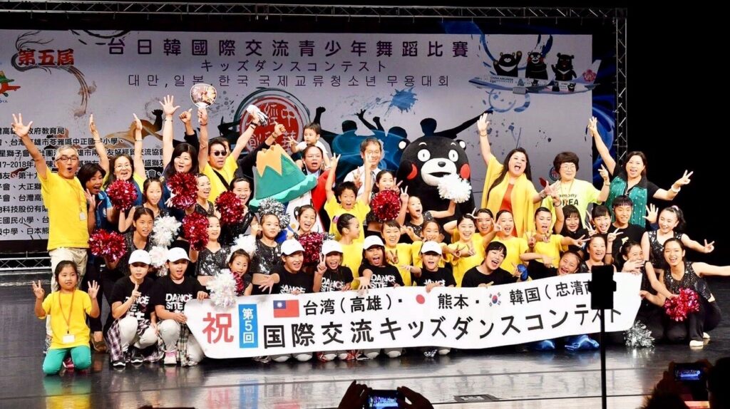 国際交流キッズダンス大会に参加 韓国、台湾、香港の皆さんと交流。2018年には台湾に行き、異文化に触れる貴重な体験ができました。小学4年生で親元離れての初お泊まりが海外というメンバーもいて、ダンスと通してすごい自信を得ました。コロナ禍は中止やオンライン大会でしたが2024年は香港、2025年は台湾と韓国が参加で復活。2026年は香港も加わり全参加になるように願ってます。