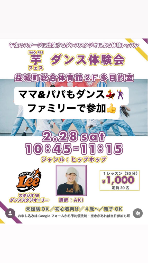 2月28日、益城体育館で行われた🍠芋フェスイベント内にてダンスの体験会を行いました。今回はママ&パパもみんなで体を動かして楽しもう! ダンスで笑顔といい汗! をコンセプトに行いました。